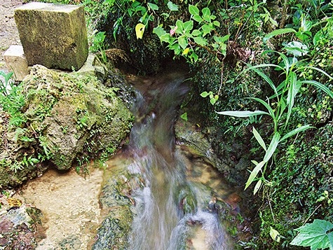 百名の海岸からほど近い2つの泉。西側を受水、東側を走水といい、受水に面して御穂田(ミフーダ)と呼ばれる田がある。