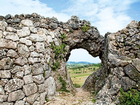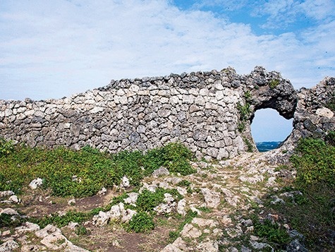標高約180メートルの天然の要塞に築かれた城跡。急な階段を上ると、石灰岩をくり抜いた印象的な円形の城門があり、ここからは久高島や沖縄本島の中南部が一望できる。当時から現在に至るまで聖地を巡る「東御廻り(あがりうまーい)」の拝所の1つとして参拝者が絶えない。