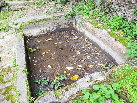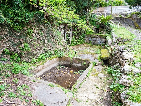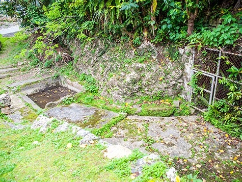 周辺地形より1メートルほど低くなる場所に造成されたアーチ型の天井を持つ樋井。主に粟石を使っていますが、向かって左側は自然石が使用されてることから、アーチ部分は明治以降に作られたのではないかと見られている。昔は井戸から直接飲み水を汲み、井戸前の広場で芋を洗い、向かって左側の池で女性たちがゆんたくしながら洗濯する姿が見られました。上の井同様に、ウヮークルシーの日にはチーイリチーが供えられていました。