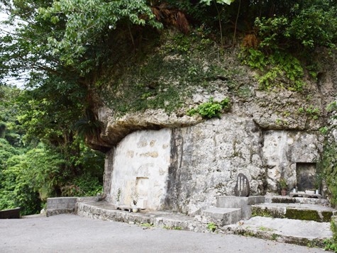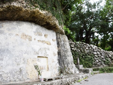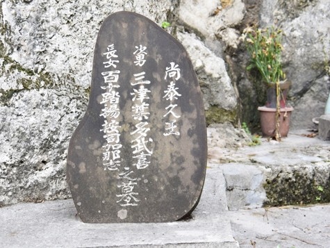 尚泰久王の長女で勝連按司であった阿麻和利の妃だった百十踏揚(ももとふみあがり)の墓。阿麻和利が倒れた後、鬼大城といわれた越来城主の大城賢雄に嫁いだ百十踏揚は、尚円王によって大城賢雄が敗れてからは、玉城富里に住む弟の三津葉多武喜(みつばたぶき)のもとに身を寄せたといわれている。墓は西ヒチ森(いりーひちむい)の大岩に安置されていましたが、1962年頃に中学校校舎建設のために現在の陸上競技場東側にある仲栄眞腹門中(なけーまばらもんちゅう)のそばに三津葉多武喜とともに安置されている。