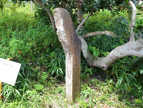 そのひとつは、手登根大比屋が第一尚氏王統時代に明国から持ち帰ったという伝説です。ふたつ目は、手登根大比屋が「アカバンター」(手登根集落後方にある丘陵上の地名)から投げて、現在の位置に突き立ったという言い伝えです。