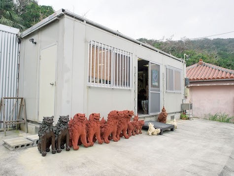 昔ながらの風情が残る集落にある、シーサー作家 佐野壽雄さんの工房兼ギャラリー。手びねりで制作するシーサーはどれも一点もので、作品ごとに生き生きとした個性を放つ。沖縄県工芸公募展で最優秀賞を受賞するなど、美術品としての評判も高く、県外からの注文も多い。
