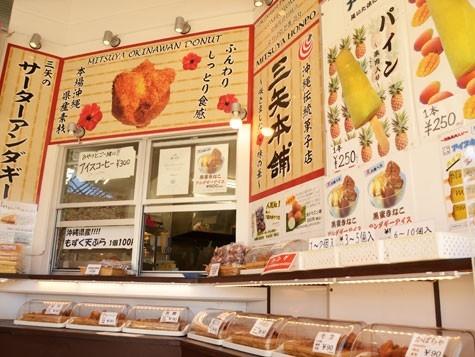 沖縄の伝統菓子「サーターアンダギー」は観光客にも大人気。その専門店が三矢本舗です。専門店ならではの豊富な種類が自慢。黒糖、パイン、紅芋などたくさんのフレーバーのうち、季節に合わせて7種類ほどを提供しています。純黒糖や生のフルーツを練り込み、素材にもこだわっています。このほか、一日限定100個、タピオカ粉で作ったふんわり「三矢ドラゴン球」も人気。