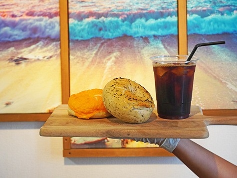 ベーグルは国産小麦と天然酵母を使って店内手づくり。チェダーチーズ、キャラメルチョコといった定番のフレイバーのほか、奥武島産もずくと沖縄県産岩塩を練り込んだ限定メニューも。ふかふかでもっちり、やさしい味のベーグルは、キリッとしたコクのあるコーヒーとよく合います。
