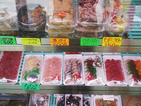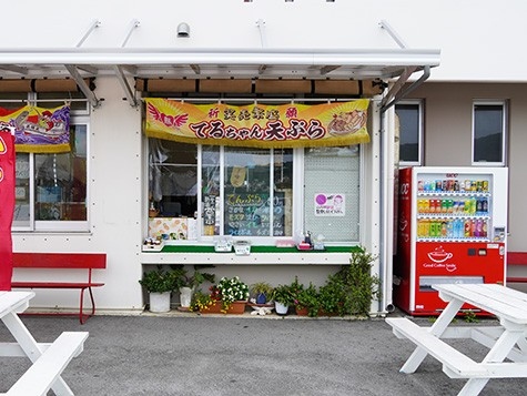 注文を受けてから揚げる、確かな名店の味。定番の魚やイカのほか、野菜やモズクの天ぷらは具材がたっぷり。海ぶどう天ぷらは奥武島の中でもここだけの逸品。鮮魚店内には、さしみやマグロ唐揚げなどの海産物商品も豊富に揃っているので、ぜひ覗いてみてほしい。