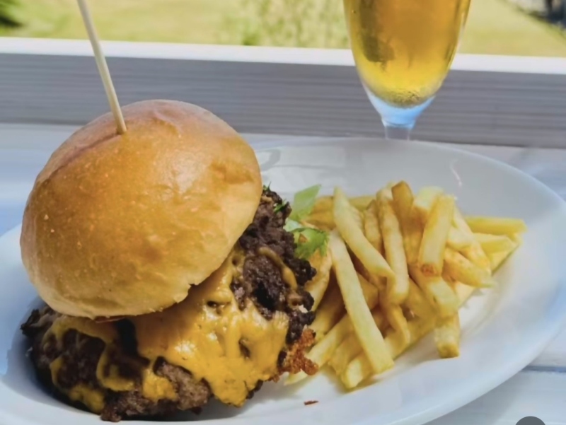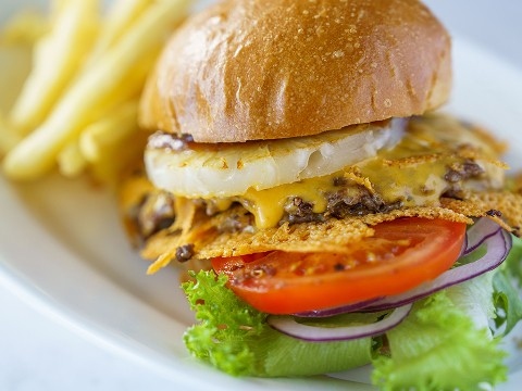 青く輝く海と広々とした芝生、そして目の前に広がる久高島を眺めながら、当店自慢のオリジナルスマッシュバーガーをゆったりとお楽しみいただけます。