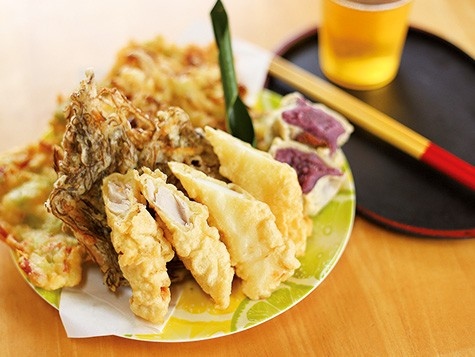 いつでも揚げ立てが味わえるてんぷら屋。定番のサカナやイカなど、メニューは11種類から選べる。どれも具が大きくて食べごたえも抜群!