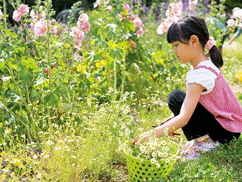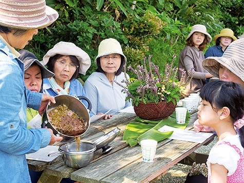 約2,000坪の多種多様な花やハーブが風に揺れる広大なハーブ園で、ハーブ摘みや石けん作り、ピザ作りが体験できる。ドラム缶釜で焼くピザ作り体験は10名以上の参加で大人2,000円~(1週間前までに要予約)。10〜12月はローゼルの摘み取りとジャム作り体験も。