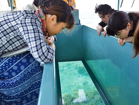 南部でもとくにサンゴ礁が美しいことで知られる奥武島のグラスボート。見どころは色とりどりの熱帯魚で、奥武島の海を知りつくした船頭さんのユーモアあふれる解説も楽しく、30分があっという間に過ぎる。予約不要で2人以上集まったら出航という気軽さもうれしい。