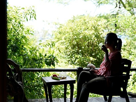ハイビスカスなどのハーブティーを味わいながら、さちばるの庭や近くの山で採れた月桃の葉、ヨモギ、、さし草の葉・花・実で足湯をお楽しみいただけます。