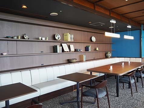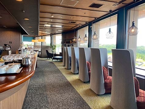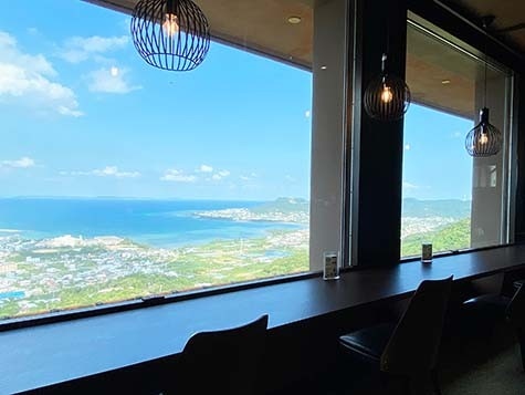 ユインチホテル南城は中城湾と田園風景を見晴らす高台に位置します。その風景を一望する展望ラウンジは、日中はリモートワークスペース、夜はバーラウンジにもなるラグジュアリーな空間。
