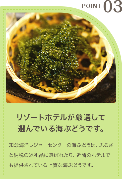 南城市の深海の水で育った知念海洋レジャーセンターの海ぶどうは、とてもきれいです。