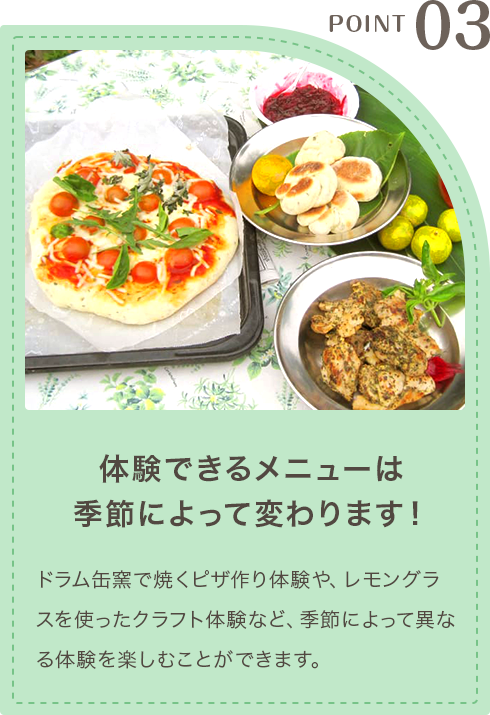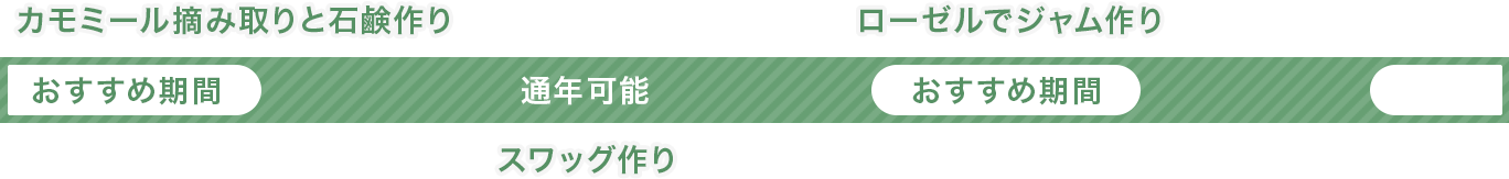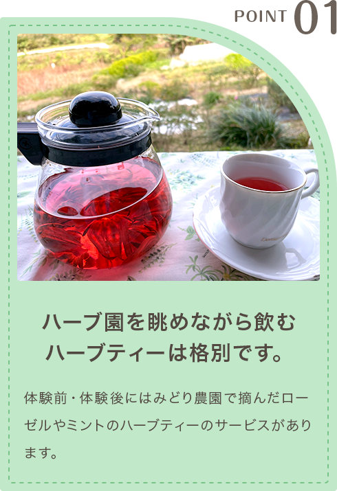 季節ごとに多種多様のハーブを栽培しているみどり農園では、その時期にしかできない特別な体験をお楽しみいただけます。 春にはカモミールやラベンダーで石鹸や花束作り。秋にはローゼルが色づいて綺麗なワインカラーに染まった農園で、摘み立てのハーブティーを飲むことができます。