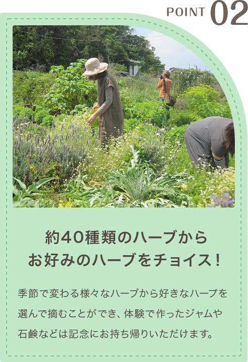 広大な農園で季節のハーブや花に癒されながら、摘み取り体験ができます。摘みとったハーブは、その場でジャムやスワッグ、化粧水やクラフト作りができるので、自然の中で楽しめる魅力がいっぱいです。
