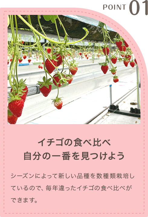 複数の品種を栽培している「美らイチゴ南城ハウス」だからこそ、品種によって異なる甘味や大きさの違いなどを味わうことができます。