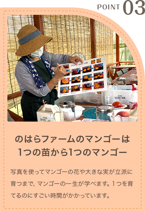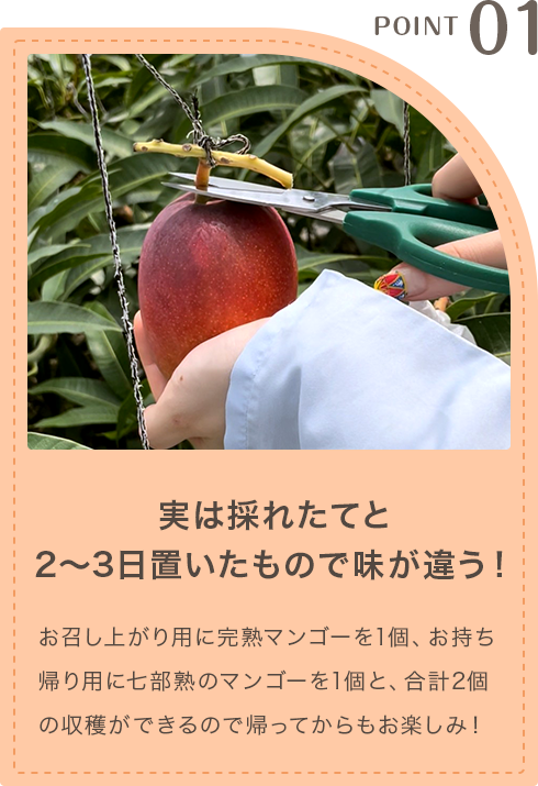 沖縄でも珍しいマンゴー農家によるマンゴーの収穫体験ができ、完熟したマンゴーをその場でカットしてお召し上がりいただけます。収穫前にマンゴーの熟度や成長過程などの説明がありますので、ご自身で美味しいマンゴーを見極めて収穫をお楽しみください。