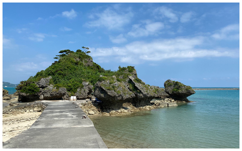 アマミキヨがニライカナイからはじめに降り立ったとされる場所。島内にはアマミキヨが降り立ったといわれる「カベール岬」、琉球開闢(かいびゃく)の七御嶽の一つ「フボー御嶽」、五穀の壺が流れ着いたと伝わる「イシキ浜」などの聖地がある。