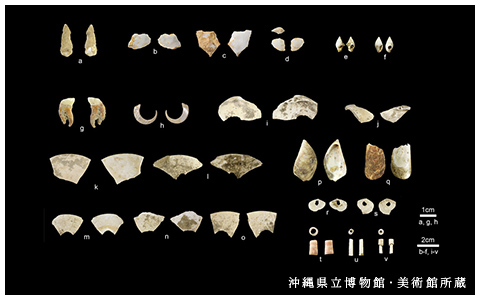 Ⅱ層からは、ギンタカハマという巻貝で作られた14㎜の世界最古の小さな釣り針(約23,000年前)やマツヤマワスレという二枚貝を使った扇型の貝器、ツノガイのビーズといった多様な貝製品が見つかった。こうした遺物は火山灰起源の堆積物に覆われた日本列島の多くの地域では遺跡に残ることはほとんどないが、隆起サンゴ礁を起源とする石灰岩の大地が広がる南城市にはこうした貴重な旧石器時代の遺物が豊富に残されているということが明らかになってきた。発掘調査は現在も継続中であり、続々と新たな発見がもたらされ、今後の動向にも大きな期待が寄せられている。