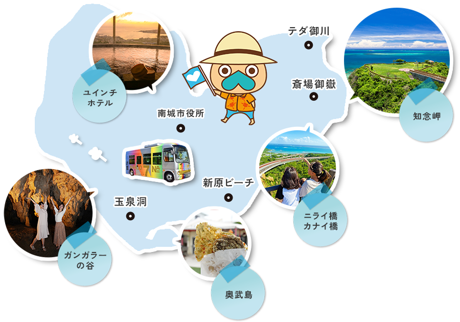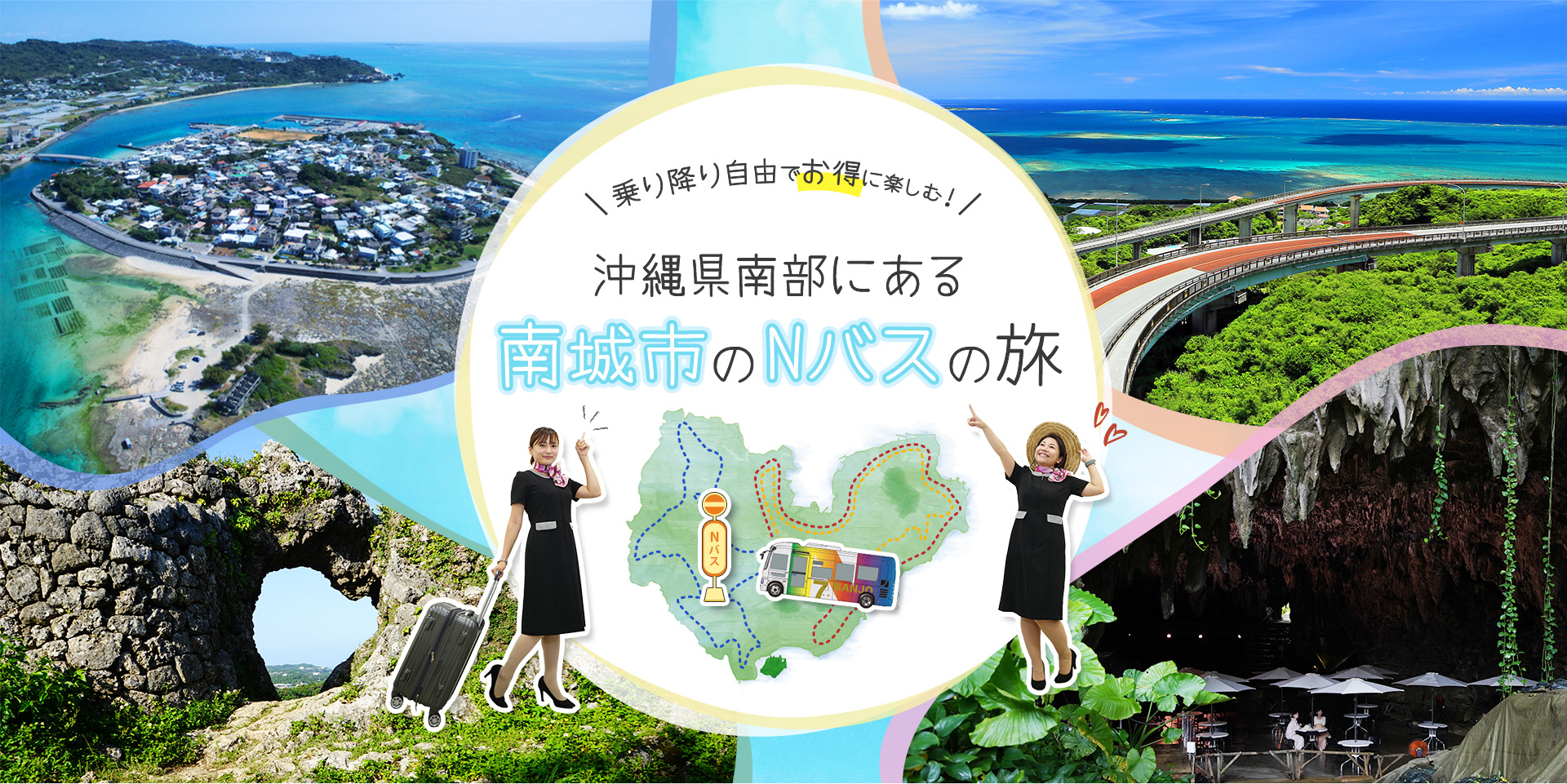 沖縄県南部の南城市内での周遊には、市内線バス「Nバス(エヌバス)」が便利。南城市在住の方はもちろん、沖縄県外・南城市外の方もご利用が出来ますので、南城市の主要観光スポット巡りに最適です。