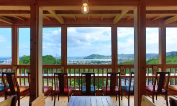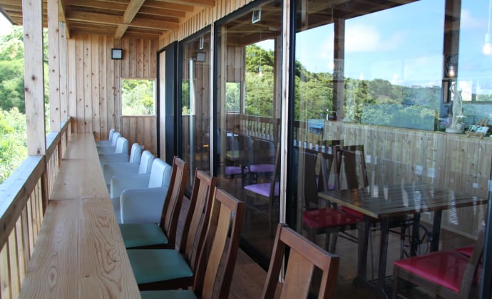 店内から広がる絶景が最大の魅力です。晴れた日には、テラス席から津堅島と美しい海が一望できます。靴は脱ぐスタイルの店内では、開放的な気分でよりリラックスした癒しの時間をお過ごしいただけます。