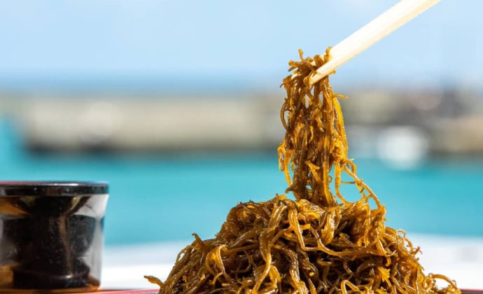 沖縄県南城市にある奥武島で養殖している太もずくを100%使用しています。美しい海と豊かな自然に育まれた太もずくは沖縄など南西諸島特有のもずくで、県外ではほとんど見られない、コリコリとした歯ごたえがあるのが特徴です。