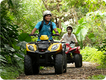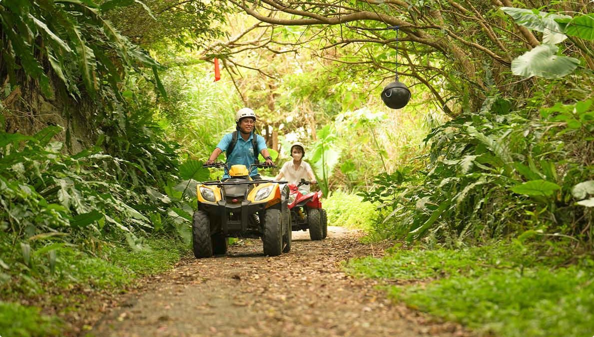 沖縄の楽しみ方は海がメインのマリンレジャーばかりではありません。南城市は山々に囲まれ美しい緑も豊富なため、自然をいかしたモータースポーツにもトライできます。荒地を走行するための四輪自動車・バギーで、大地の起伏をダイレクトに感じるスリリングなアウトドアを体験。運転免許も必要ないので、お子様(11歳~)でも楽しめます。珍しい南国植物に触れたり、バギーのコースでしか見る事のできない名所なども盛りだくさん。経験豊富なインストラクターがお客様のスキルに合わせてコースをカスタムしてくれるので、初心者でも安心して乗ることができます。大自然を全身で感じる本格バギーにぜひチャレンジを。