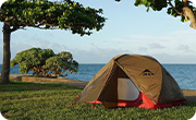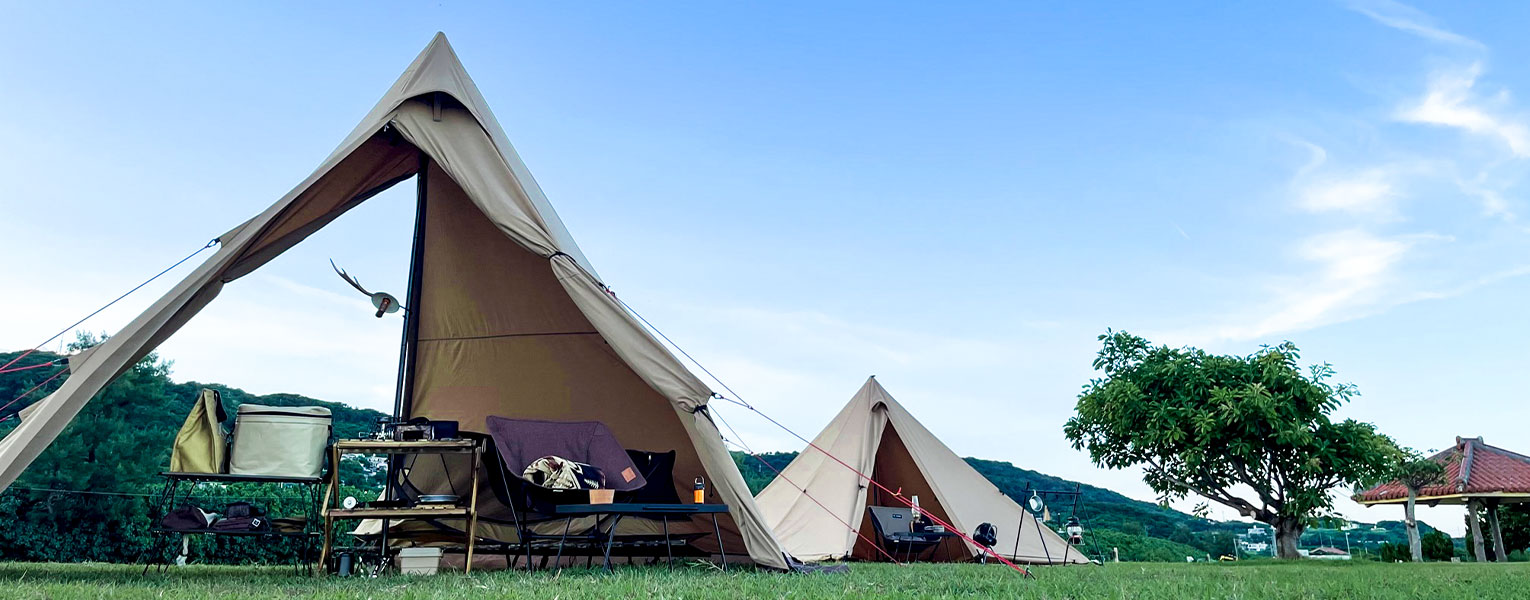 南城市の高台に佇む「ユインチホテル南城」。緑に囲まれた広い敷地内で楽しめるキャンプは、絶景が臨める「スカイオーシャンフィールド」とアクティビティを楽しむ「グリーンレジャーフィールド」の2つのエリアがあります。ホテル併設という充実の施設なので、バギーやフリスビー、モルックなど大人も子供も飽きずにレジャーを満喫できるのも魅力的。高台からの美しい景色とともにアクティブな時間が過ごせます。