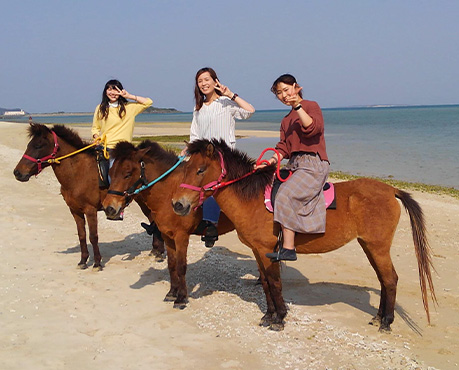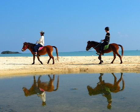 おっとりした性格で人懐っこくフレンドリーなヨナグニウマ。大きさも120センチ前後とポニーくらいのサイズなので乗馬初心者や小さなお子様でも気軽に乗ることができます。冬限定のビーチライドでは、美しい百名ビーチを馬に乗て歩くことができる沖縄ならではのアクティビティを体験。観光名所に沿って沖縄の歴史などについて詳しく聞くことができ、ひと味違った楽しみ方を堪能できます。
