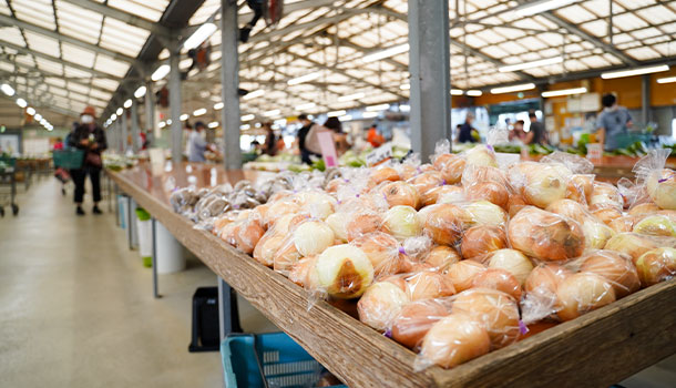 地元の農家さんの新鮮な野菜が揃う「かりゆし市」。暖かい沖縄は冬でも野菜の種類が豊富です。夏野菜のイメージが強いトマトは沖縄では冬が旬で一番おいしい時期。甘みが強いので、アクアパッツァなどの加熱料理にするとお魚のうま味にコクが加わり絶品に!その他ヘチマをグリルにしたり、皮付きのヤングコーンを皮ごと焼くツウな食べ方もおすすめ。