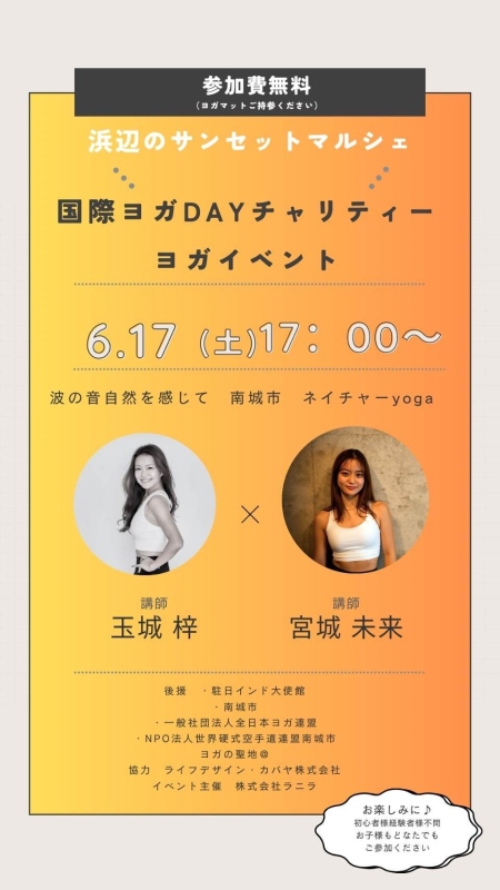 波の音を感じて南城市ネイチャーyoga日 時: 2023年6月17日(土)17時~18時会 費: 無料会 場: 南城市グスクロード公園 玉城字中山1212インストラクター 玉城 梓 × 宮城未来問い合わせ 080-1503-9077(ラニラ)主 催: ラニラ(株)後 援: 駐日インド大使館・南城市・全日本ヨガ連 盟、 世界硬式空手道連盟協 力: ライフデザイン・カバヤ(株)