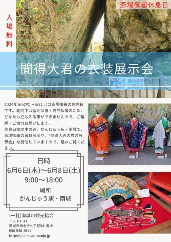 がんじゅう駅・南城では休息日のみ特別に聞得大君の再現衣装を展示しております。是非、お立ち寄りください。