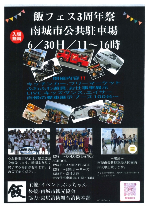 | 開催内容 | キッチンカー、フリーマーケット、ふわふわ遊具、お仕事車展示、LIVE、キッズダンス、エイサー、自慢の愛車展示ブース100台~ |