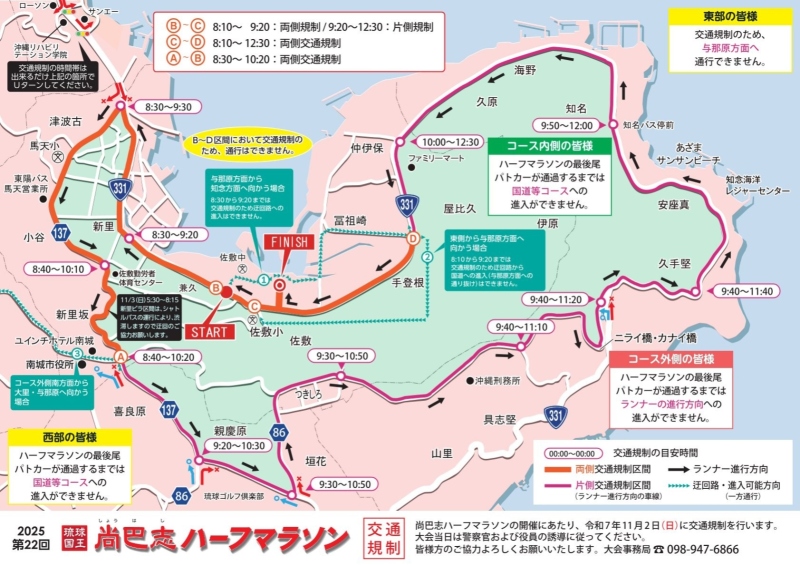 尚巴志ハーフマラソンの開催にあたり、令和 7 年 11 月 2 日(日)に交通規制を行います。大会当日は警察官および役員の誘導に従ってください。皆様方のご理解ご協力をよろしくお願いいたします。大会事務局 : 098-947-6866