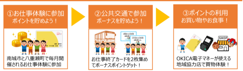 沖縄県の地域交通ICカード「OKICA(オキカ)」は、商業施設等でのキャッシュレス決済にも対応しており、お仕事体験後に子供たちに付与する「お仕事ポイント(OKICAポイント)」を、子供たちが地域店舗で使用することで地域経済の活性化にも貢献することを目指します。