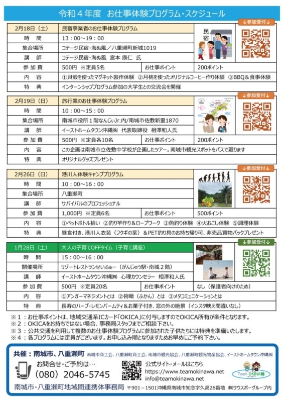 南城市や八重瀬町の既存資産を最大限に活用(マッチング)し、これまでにないお仕事体験プログラムを開発し、集客を図り、地域経済の活性化を目指します。経営体力に限りがある小規模事業者や中小企業の経営者の皆様と膝を突き合わせ、魅力的な学習・滞在型観光メニューでの町おこしを計画します。