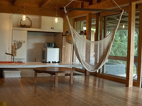 南城市の作家ものの食器や、広々としたリビング、大きな窓ガラスから見える、豊かな緑。