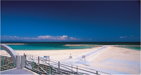 あざまサンサンビーチは、平成12年4月にオープンした南城市を代表するビーチのひとつ。沖縄の神の島とされる久高島に渡るフェリーが発着する安座真(あざま)港に隣接し、人工ビーチながらもその海の透明度は高く、また、白い砂浜も長く美しく、遊泳エリアも広いのが人気の秘密です。