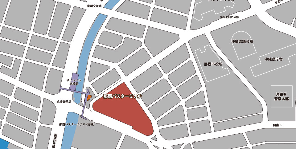 那覇空港からはゆいレール(沖縄都市モノレール)で「旭橋駅」までお乗り下さい。旭橋駅東口から「那覇バスターミナル」(1階)へ歩いてすぐ。