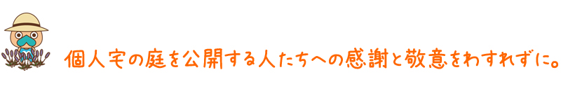 「憩いのオープンガーデン」は、庭主さんの好意と善意にもとづき、実現しています。公開するのも個人のお庭です。お互いに楽しく観覧し、今後継続していくためにも下記のマナーをお守りください。