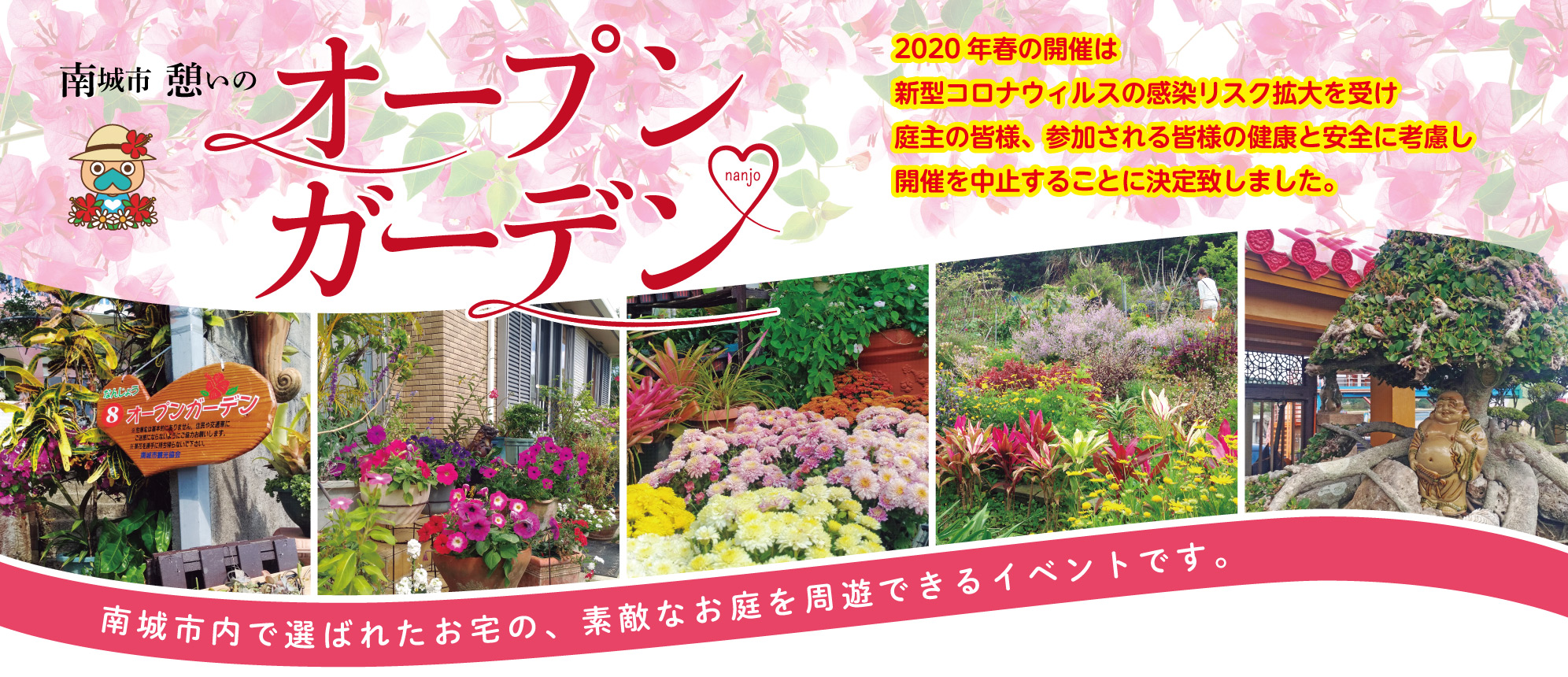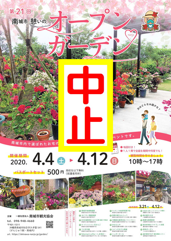 2020年4月4日(土)〜4月12日(日)に開催を予定いておりました「2020年春 南城市憩いのオープンガーデン」及び、2020年4月3日(金)〜4月5日(日)に開催を予定しておりました「ガーデニングフェスタ」は、新型コロナウイルス感染症の拡大を受け、庭主の皆様、参加される皆様の健康と安全に考慮した結果、開催を中止することに決定致しました。何卒ご理解の程宜しくお願い申し上げます。
