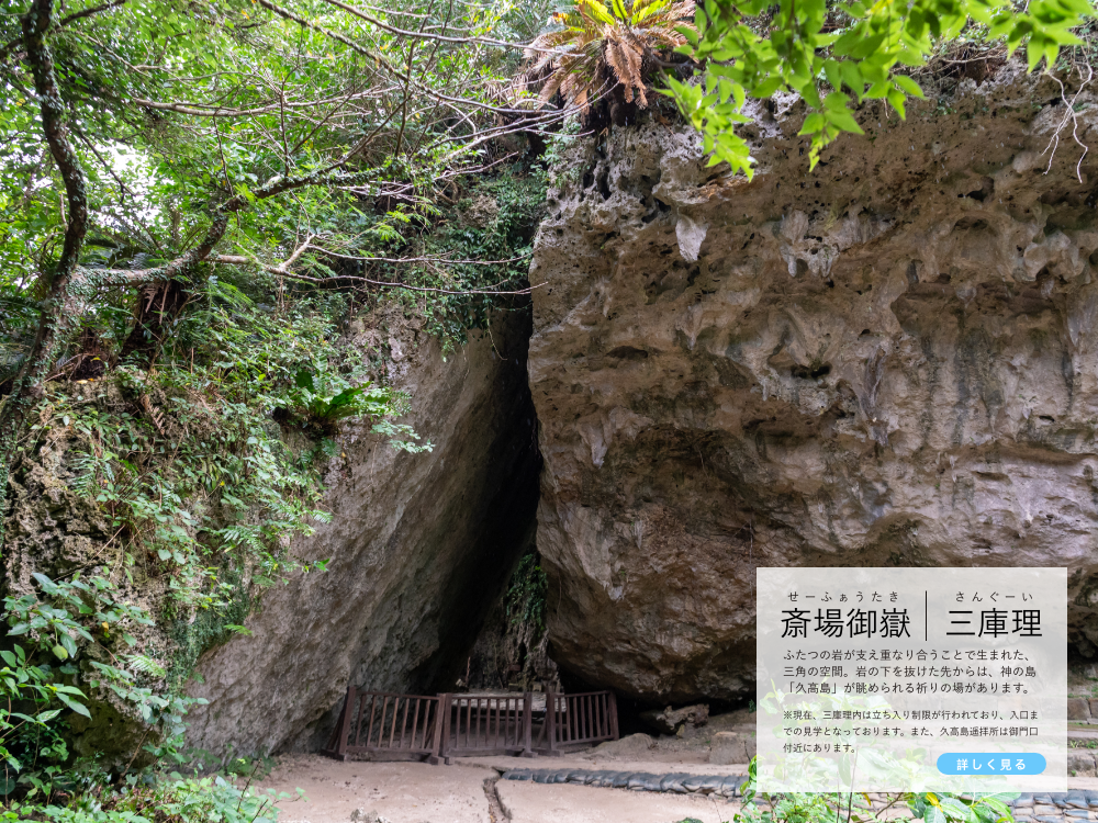 琉球王国の時代から、国王を任命する聞得大君(きこえおおきみ)と呼ばれる女性の神の使いの就任儀式の場所でもありました。「三庫理(さんぐーい)」は、岩と岩が重なり合って生まれた、三角の空間。