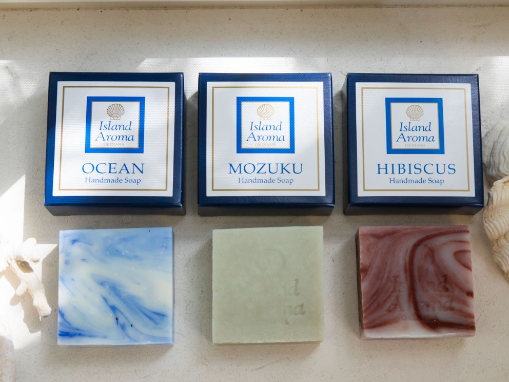 工房内には、ハイビスカス、もずく、シークワーサーなど、沖縄の素材を活かした手作りの石鹸が並びます。波のような色を連想させる「オーシャン」は、沖縄の塩とにがりを配合したもの。そのほか、肌をうるおすフコイダンがたっぷりの「もずく」や、フローラル系の香りの「ハイビスカス」は特に女性に人気。