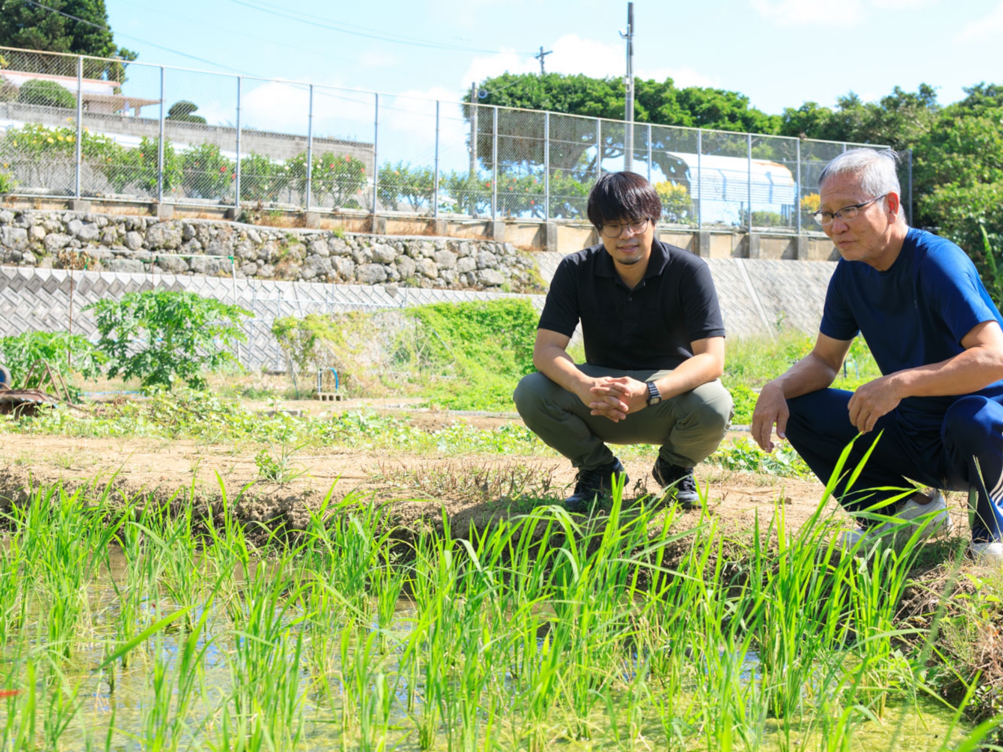 そこで、「親田御願」に伝わる沖縄在来種「羽地赤穂(はねじあかふー)」の栽培に取り組んだのが、2017年に発足した「仲村渠稲作会」です。左は、稲作会のメンバーでもあり、南城市市役所の職員でもある大城洋介さん。右は仲村渠区自治会長の石嶺真秋さん。最初の一年は、田んぼとして整地することからはじめ、翌年の2018年から稲作をスタートしました。昔ながらの農法でひとつひとつ手植えする米作りを行っています。