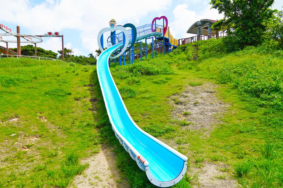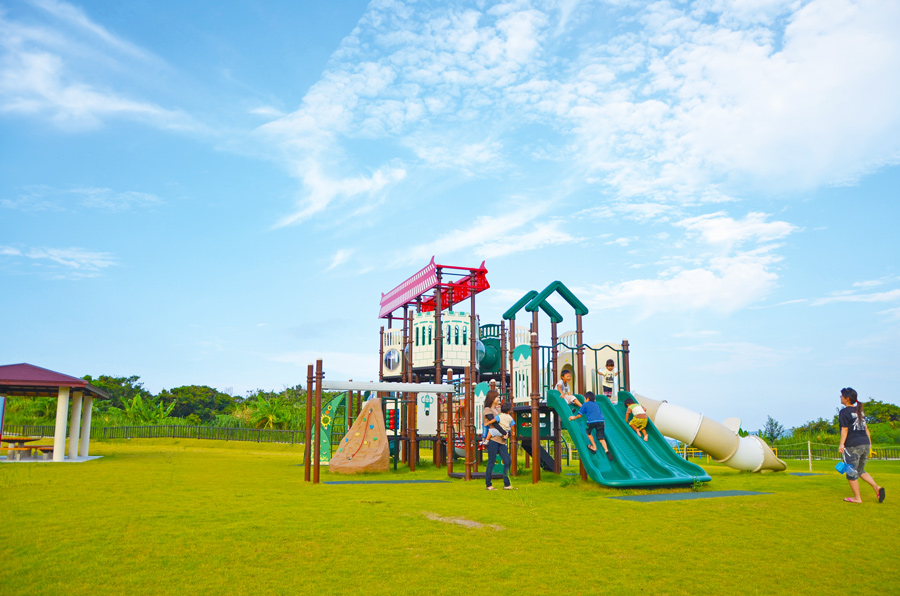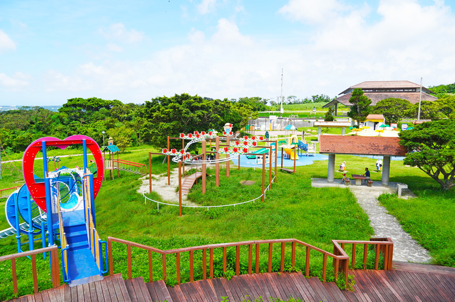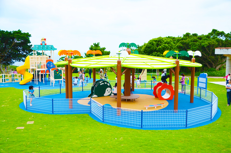 広い敷地にゆったりと配置されたたくさんの遊具。高台にあるグスクロード公園には、太平洋からさわやかな風が吹き上げてきます。遊具には人気キャラクター「なんじぃ」のデコレーションがされていて、子どもたちのご機嫌をさらに盛り上げます。【詳細ページ】