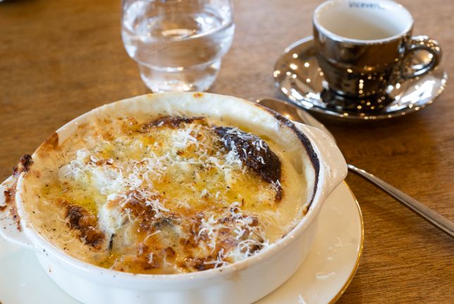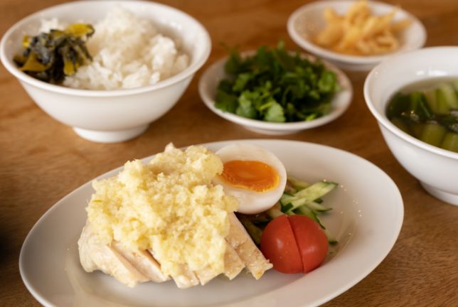 左は梅原さんによる「牡蠣とマッシュポテトの旅グラタン」(1500円)。右は亀谷さんによる「よだれ鶏定食」(1,350円)