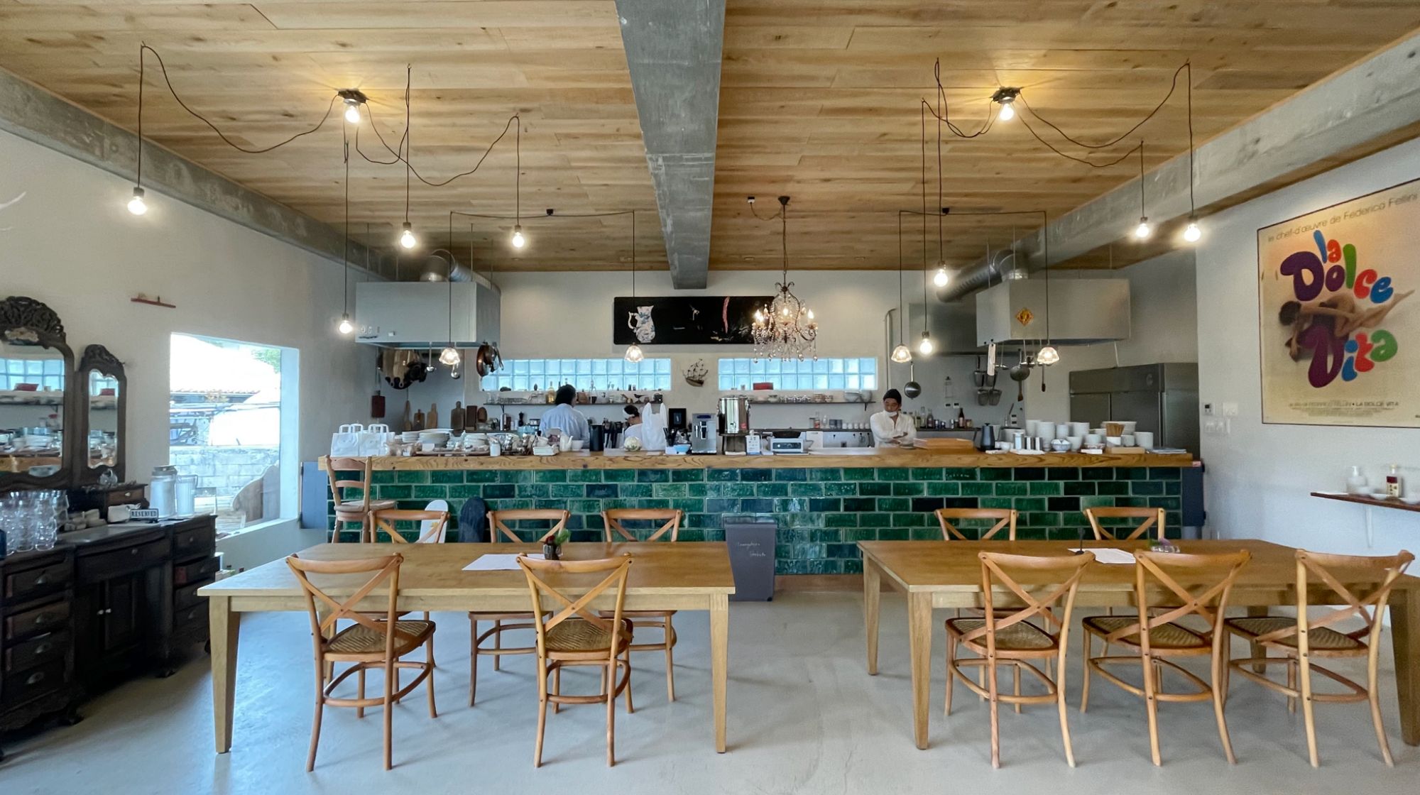 「姉と弟の家」の目の前にある「玉城食堂」。もとはこの地域の公民館として活用されていた場所で、南城市を拠点に活動する画家や陶芸家、木工作家、料理人、建築家、僧侶、区長に、今回のガイド・稲福さんも加わった9名の「タマトラアーツ&クラフツ」という気の知れた仲間たちが共同運営する食堂です。仲間うちの「宮城陶器」による、深みのあるグリーンタイルをあしらった長いカウンターでは梅原龍さんが旅を連想させる料理を、亀谷修さんが台湾を中心にしたアジア料理を提供しています。料理もお酒も、それぞれ別メニューに分かれているけれど、テーブルではどちらの料理もオーダーできる、面白い試み。