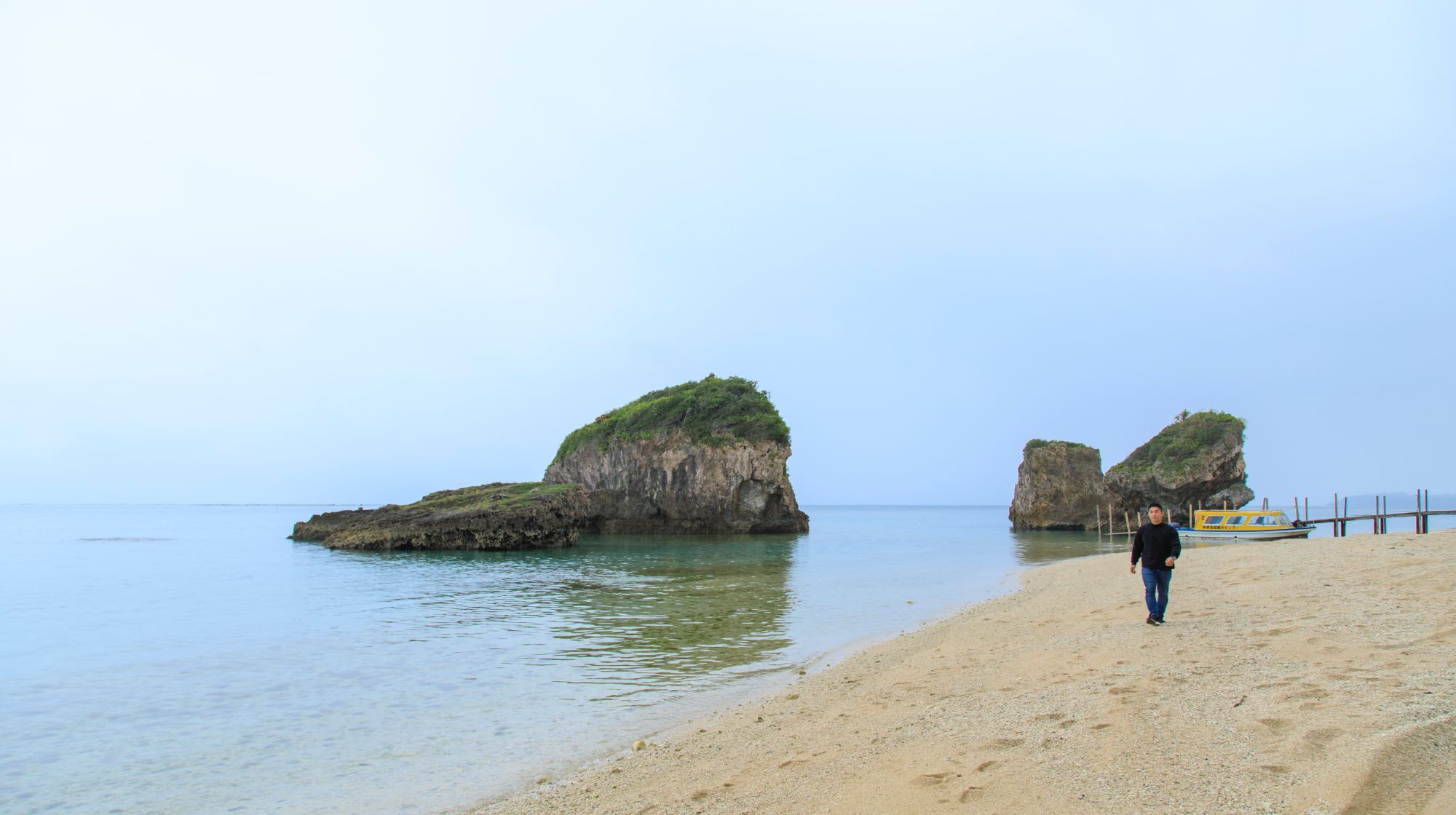次に訪れたのは「新原(みいばる)ビーチ」。先ほど訪れた「浜辺の茶屋」からは、歩いて10分弱の場所。透明度も高く、白い砂浜が広がります。ビーチの脇からは、「みーばるマリンセンター」が運行する船底がガラスになったグラスボートが出航。透明度の高い海だからこそ、色とりどりの魚たちが泳ぐ姿を眺められます。