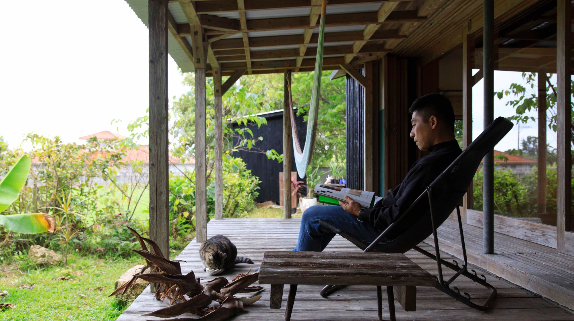 この日の宿泊は、稲福さんが営む「姉と弟の家」。姉の家、弟の家2棟のみのこじんまりとした宿は、実際に稲福さん兄姉がかつて暮らしていた住まい。木枠の大きな窓ガラスの先には、広々としたテラスが広がり、目前には南城市らしい緑に溢れた景色が広がります。宿猫のチョビもお出迎え。そっと餌をおくと、慣れたように近づいてくる姿に癒されます。広々としたキッチンには、冷蔵庫をはじめ、調理器具や、南城市内の作家たちによる器も備わっているので、気の赴くままに料理を。この日は地元のスーパーで買った食材でBBQを楽しみます。広々としたリビング、落ち着く寝室の空間。夜になると、静けさが一層と深まり、読書や星空鑑賞など、日常の忙しさを忘れ、ゆっくり落ち着いた時間が過ごせます。