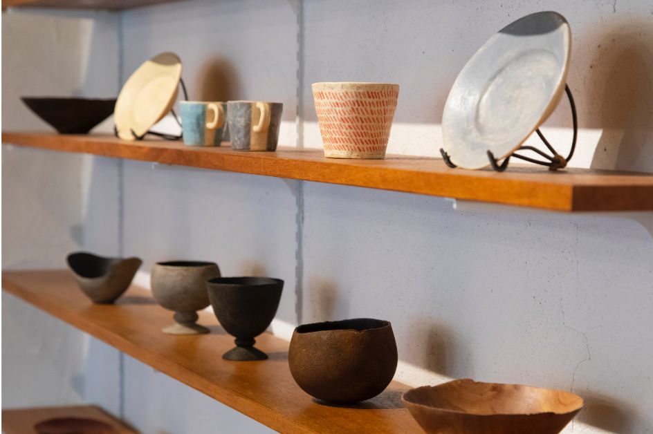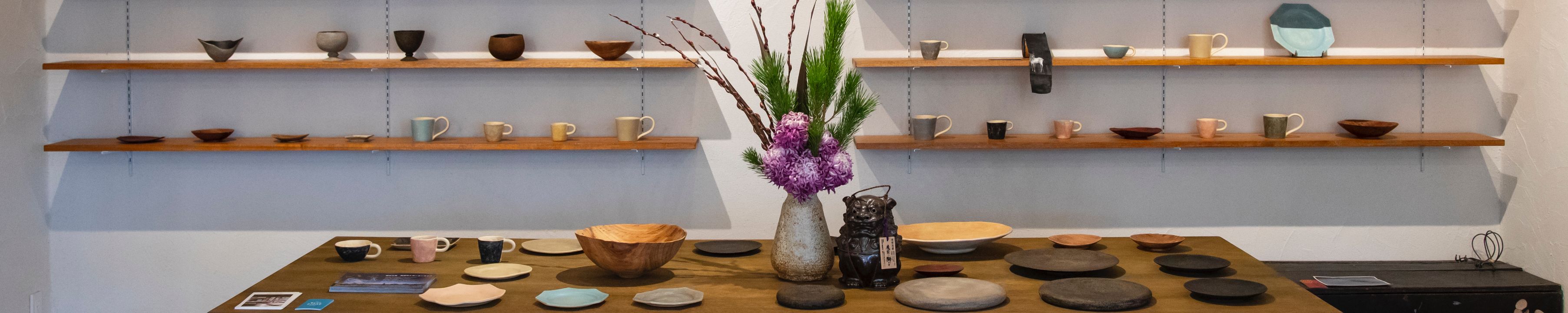 仲間達でリノベーションした店内には、梅原さんの描く作品や、海外で買い付けてきたインテリア、元々公民館で使われてきた天井の古い扇風機などがバランス良く配されています。奥には「タマトラアーツ&クラフツ」の作家たちの器を実際に手に取って購入できるスペースがあります。