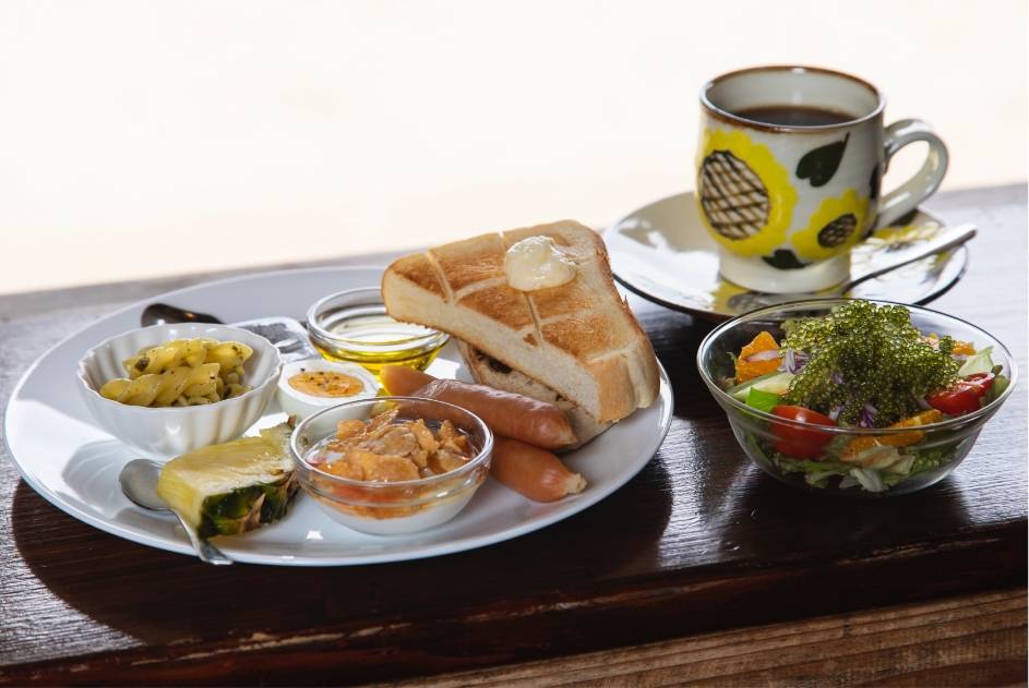 週末や祝日は朝8時からオープンしているので、朝ごはんをこちらでいただきます。カウンター席前の大きな窓の向こうは、手付かずの自然のビーチ。時間帯によって変わる潮の満ち引きや、天候によってさまざまに変わる景色を眺めながらの朝食タイムは格別なもの。「モーニングプレート」(880円)には、プチプチとした食感が楽しめる南城産の海ぶどうがのったサラダも。朝ごはんを食べたら、目の前のビーチを散策するのも楽しい体験です。